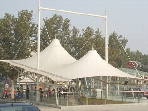 停車入口用膜結(jié)構(gòu)采用環(huán)保杜特龍面料縫制而成,具有獨特張力結(jié)構(gòu)和微孔設(shè)計;采用熱定型處理,不易收縮,不易變形,篷布大大阻擋紫外線,高強度,高透氣性,通過空氣的自由流通,營造涼爽、透氣的環(huán)境,防紫外線,防霉防蛀,便于清潔。